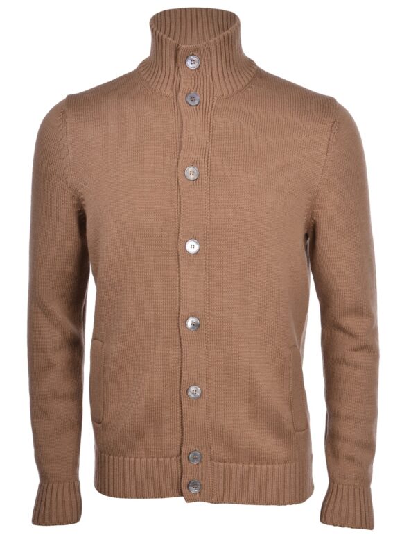 Cardigan à col montant en pure laine mérinos avec poignets et ourlet côtelés. La fermeture à huit boutons rend ce vêtement confortable et polyvalent, parfait pour être associé à une chemise au travail et pendant les loisirs.